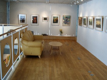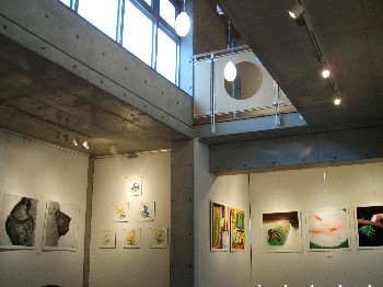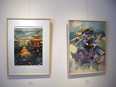 | 天井は吹き抜けになっています | 上の階に飾られたネパール作家の作品 |